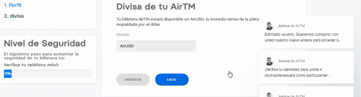 Paso 5: Por ultimo escoge la divisa predeterminada para tu cuenta de AirTM, (AirUSD) y presiona listo.